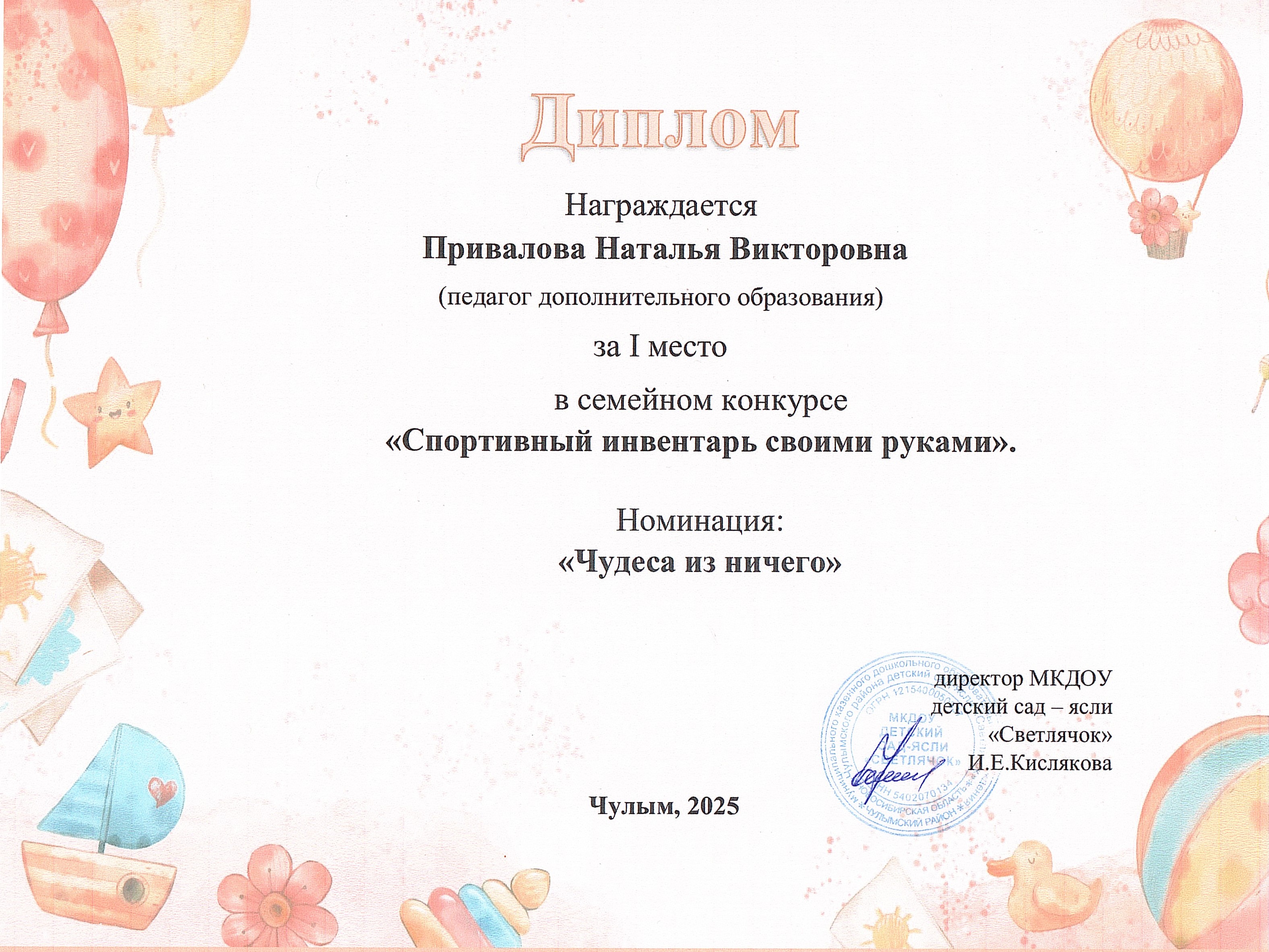 Диплом I степени в семейном конкурсе "Спортивный инвентарь своими руками"