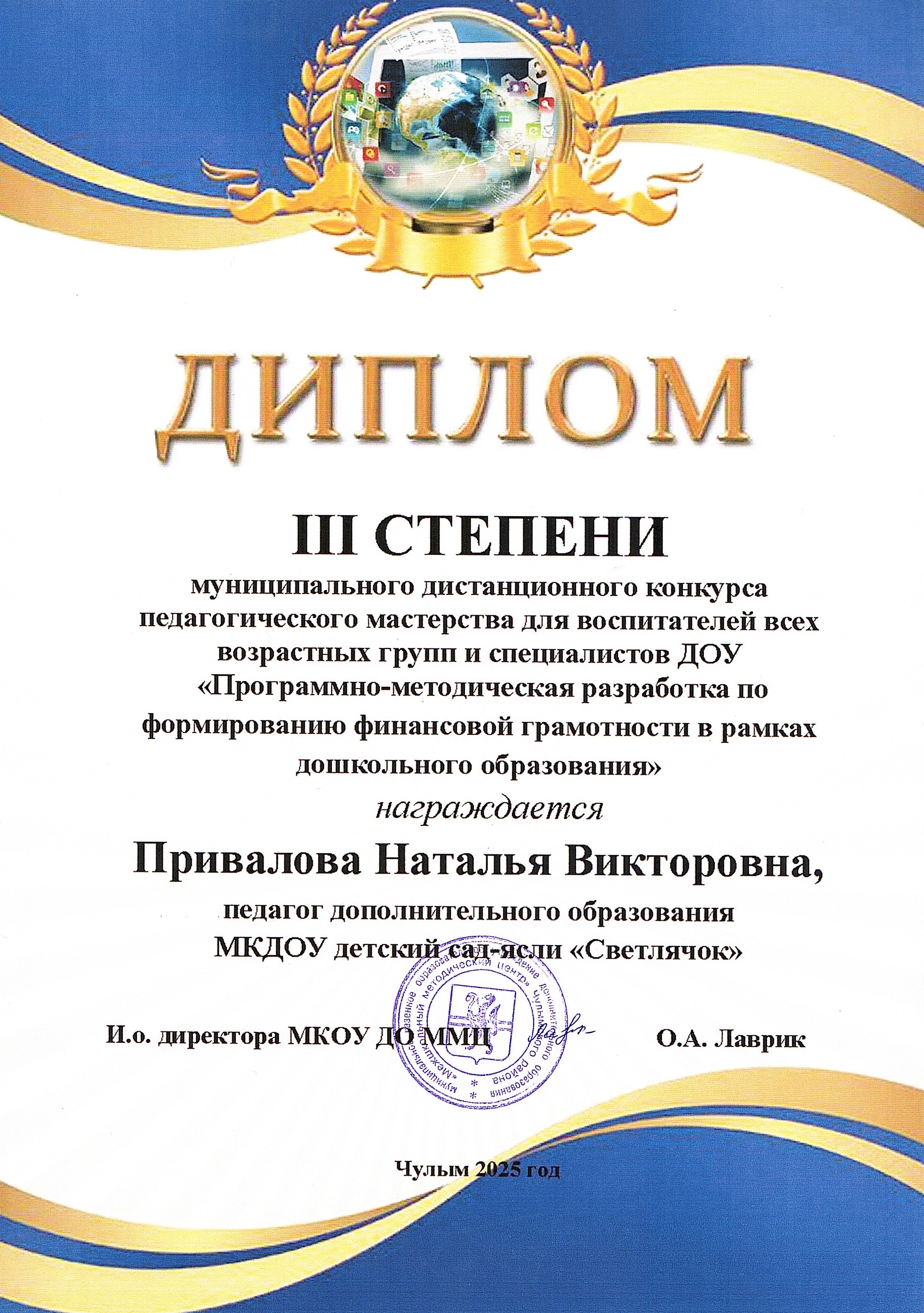 Диплом III степени муниципального дистанционного конкурса педагогического мастерства "Программно-методическая разработка по формированию финансовой грамотности в рамках дошкольного образования"