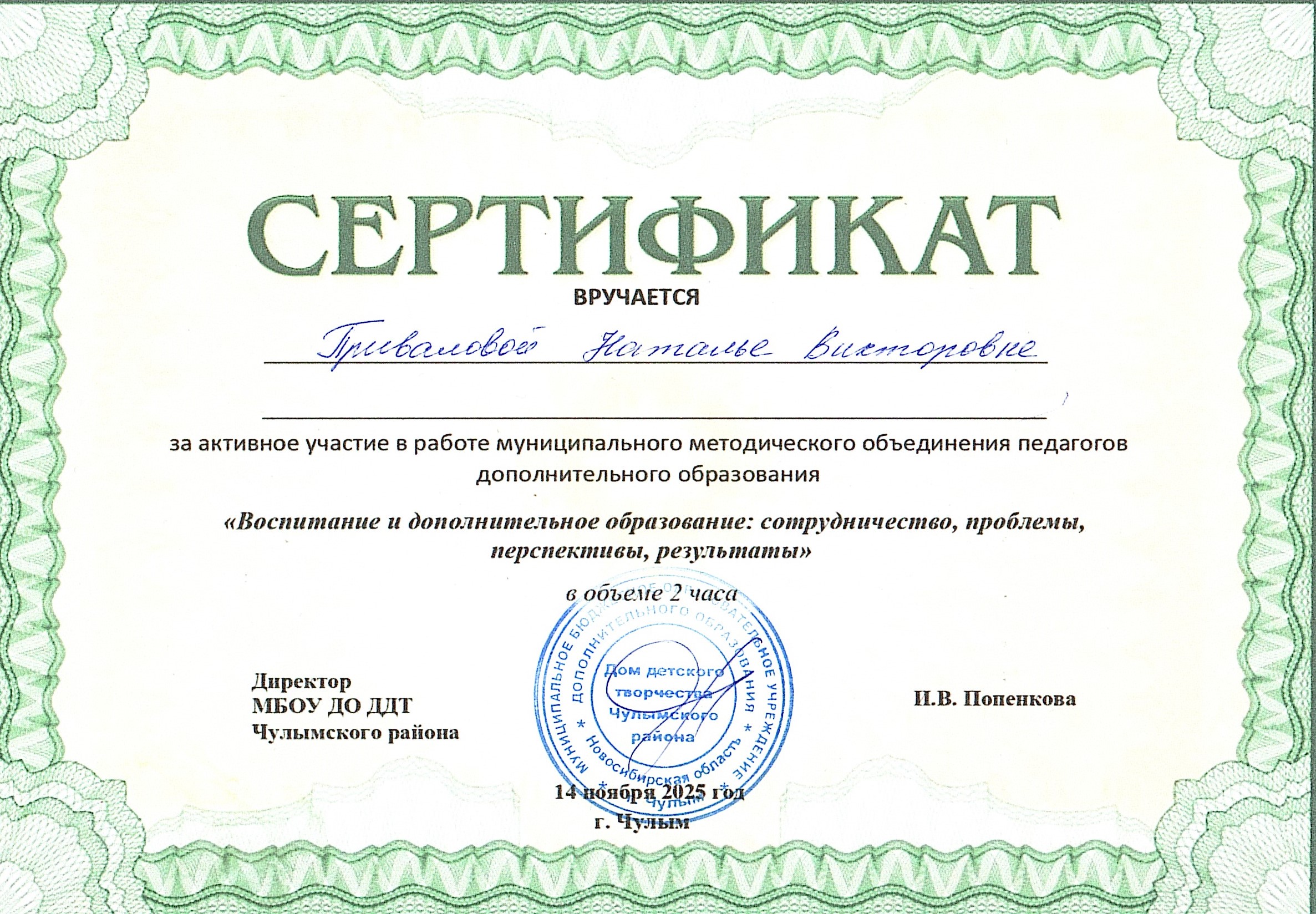 Сертификат за активное участие в работе муниципального объединения педагогов дополнительного образования